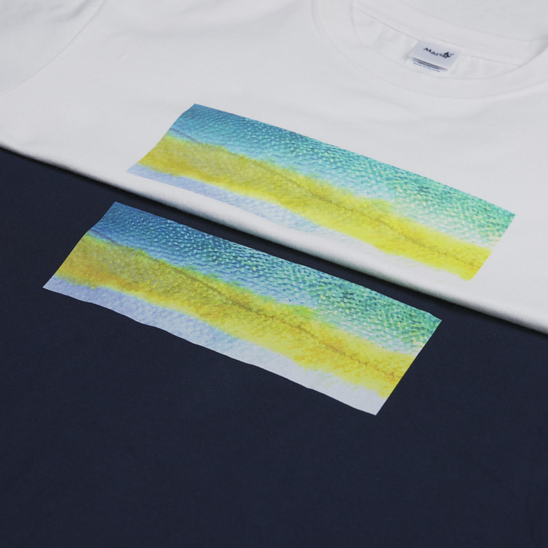 写真左:ヒラマサの美しいイエローラインを発色良くフロントにカラープリント。